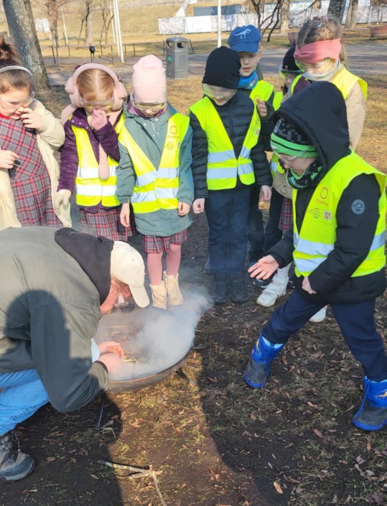 Praktinėje veiklos dalyje vaikai patys bandė įžiebti ugnį senoviniais būdais, kūrė laužą Gedimino kalno papėdėje, aptarė ugnies teikiamą naudą bei galimus pavojus ir prisiminė pagrindines saugaus elgesio taisykles gaisro metu.