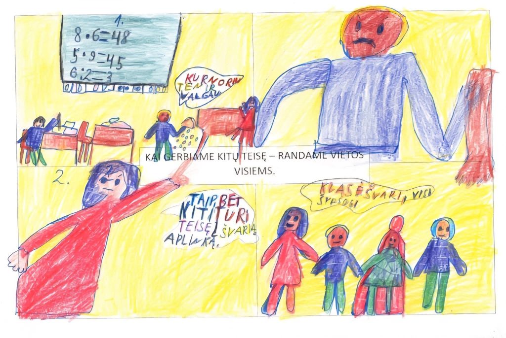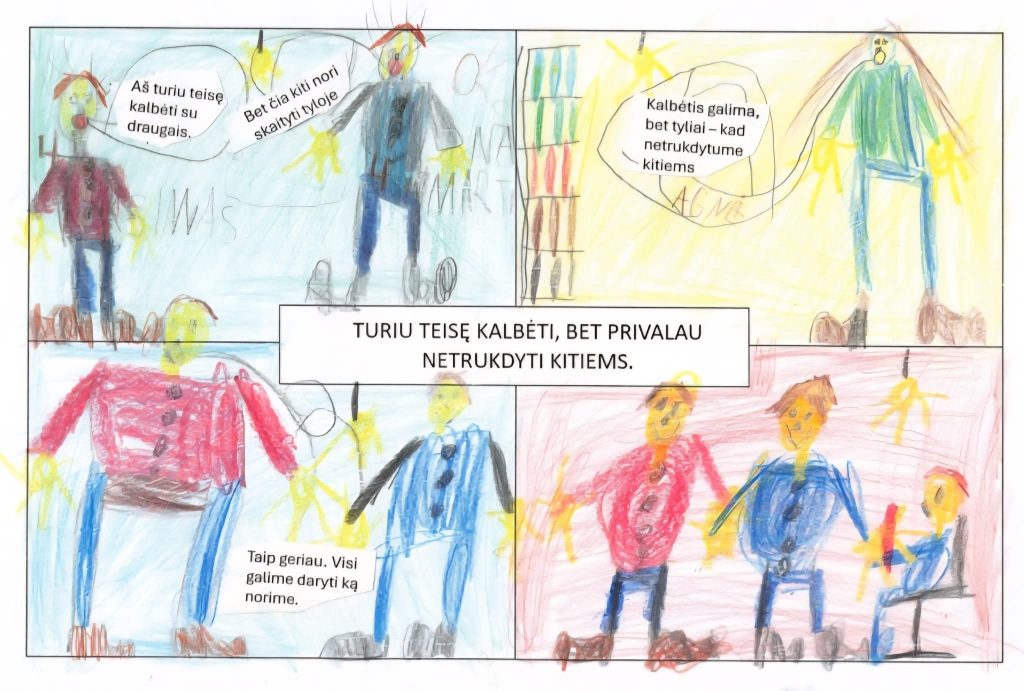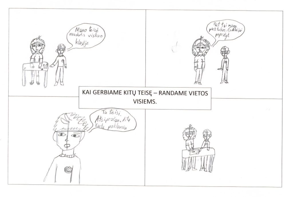 Įgyvendinant mokyklos 2025 metų veiklos plano tikslą „Padėti mokiniams suvokti sąlygas, užtikrinančias vaikystės apsaugą bei tinkamą aplinką jų augimui ir gerovei“ bei uždavinį „Gilinti mokinių teisių ir pareigų supratimą“ klasėse buvo organizuojami komiksų „Tavo teisės baigiasi ten, kur prasideda kito žmogaus teisės“ piešimai.