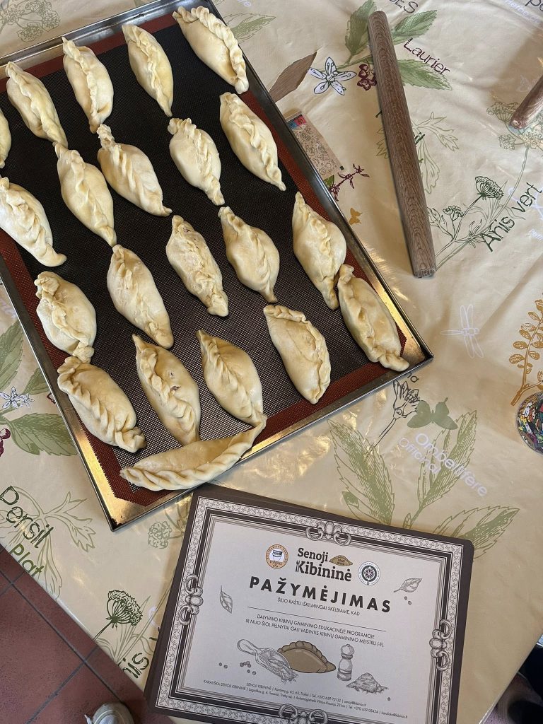 Buvo smagu dirbti kartu, padėti vieni kitiems ir stebėti, kaip mūsų rankomis gaminamas maistas. Kai kibinai iškepė, degustavome juos dar šiltus – buvo labai skanūs!