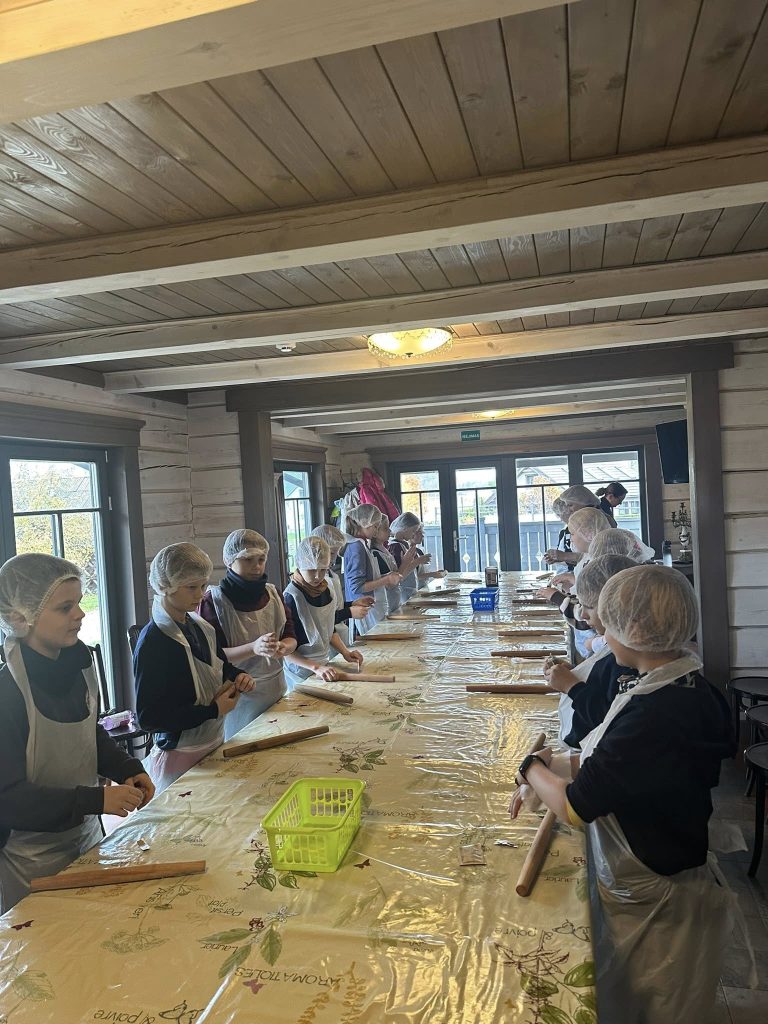 Spalio 29 d. 4d klasė vyko į įdomią ir smagią išvyką į Trakus. Ten gaminome tradicinius karaimų patiekalus – kibinus. Visi su dideliu susidomėjimu klausėmės pasakojimo apie kibinų kilmę ir sužinojome, kad šis patiekalas atsirado dar prieš kelis šimtmečius, kai į Lietuvą atsikėlė karaimai.