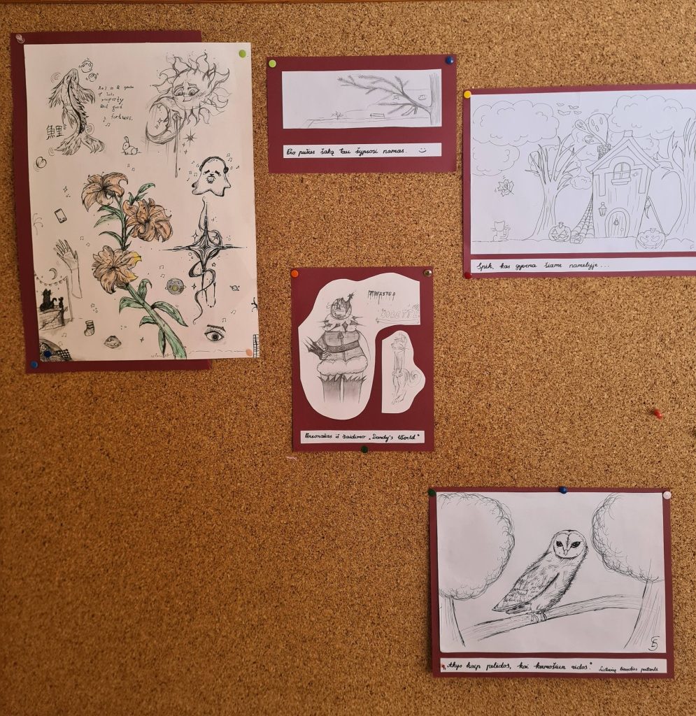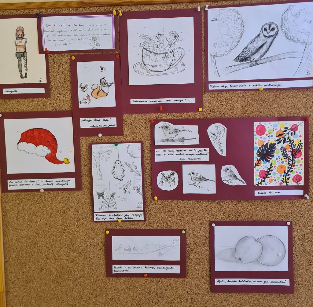4a klasės mokinės Emilios piešinių paroda mokykloje sulaukia daugybės gražių atsiliepimų – visi stabteli, šypsosi ir grožisi!