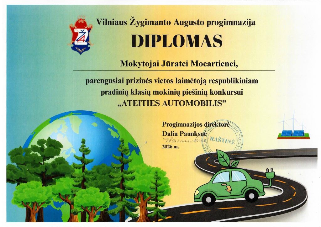 Džiaugiamės ir didžiuojamės – mūsų mokyklos 1c klasės mokinys Arijus Fijalkauskas tapo I vietos laimėtoju respublikiniame pradinių klasių mokinių piešinių konkurse „Ateities automobilis“.