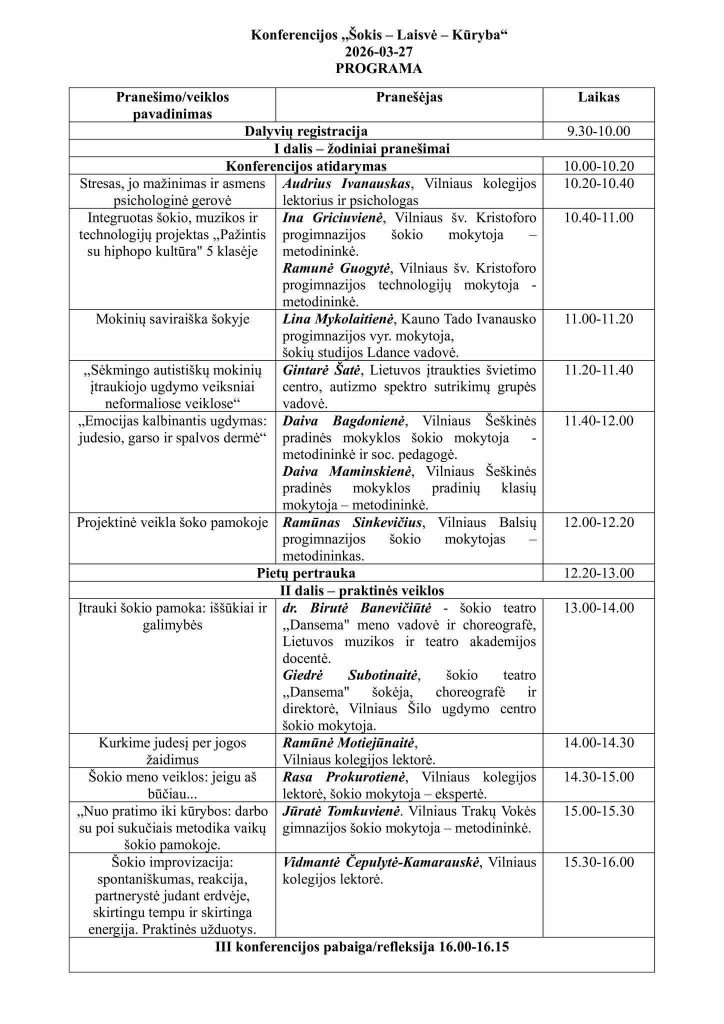 Kovo 27 d. Vilniaus kolegijos Pedagogikos fakultete vyko konferencija „Šokis-Laisvė-Kūryba”.