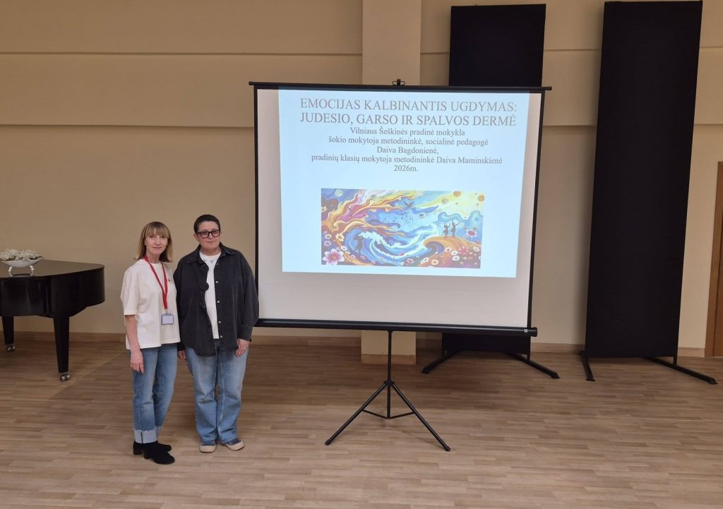 Džiugu, kad konferencijoje, kurią organizavo Vilniaus miesto šokio mokytojų taryba, Vilniaus kolegijos Pedagogikos fakultetas ir Vilniaus Balsių progimnazija dalyviai buvo ne tik iš Vilniaus, bet ir kitų Lietuvos miestų. Pranešėjai pasidalino savo darbo patirtimi, sėkme, idėjomis, kaip ugdyti mokinių saviraišką per šokį, menus. Mūsų mokyklos mokytojos Daiva Bagdonienė ir Daiva Maminskienė pristatė pranešimą „Emocijas kalbinantis ugdymas: judesio, garso ir spalvos dermė“.