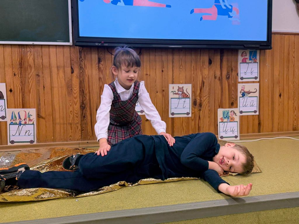 Praktinės veiklos metu vaikai mokėsi, kaip saugiai paversti žmogų į stabilią šoninę padėtį, kad būtų užtikrintas kvėpavimas ir saugumas. Pirmokai aktyviai dalyvavo diskusijose, dalijosi savo mintimis, uždavinėjo klausimus ir aptarė, kaip kiekvienas gali padėti kitam nelaimės atveju.